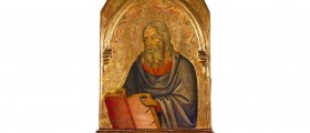 Questa tavola cotituiva la cuspide di un polittico che Andrea di Bartolo realizzò per il Duomo di Tuscania verso la fine del terzo decennio del Quattrocento. La genericità degli attributi che accompagnano la figura rende difficile l’identificazione del santo personaggio il quale, penna e calamaio alla mano, doveva certamente raffigurare uno dei quattro Evangelisti intenti alla scrittura dei testi evangelici: gli ampi mantelli che ne avvolgono i corpi rappresentano del resto quel particolare tipo di abbigliamento codificato dalla tradizione iconografica in merito alla rappresentazione dei personaggi biblici. L’intensa concentrazione delle espressioni, propria delle persone impegnate nello sforzo della elaborazione mentale, viene come sottolineata dal fitto reticolo di rughe che percorre i volti del personaggio, la cui veneranda età sembra tuttavia contraddetta dal robusto plasticismo del corpo che lievita sotto le pieghe degli abbondanti panneggi: questa particolare interpretazione della natura fisica, rimanda direttamente ai modi pittorici di Taddeo di Bartolo, cui Andrea mostrerà di accostarsi nel periodo più tardo della sua carriera.